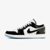 Este Air Jordan 1 de cano baixo apresenta uma base de couro branco com línguas de malha e Swooshes e sobreposições de couro envernizado preto. Jumpman preto nas línguas, asas brancas nos calcanhares, palmilhas inspiradas no AJ11 no topo de uma entressola branca e sola translúcida gelada completam o design.
