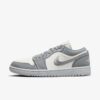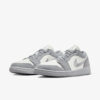Vestido com um esquema de cores Light Steel Grey, Sail e White. Este Air Jordan 1 Low apresenta um cabedal de couro Sail com sobreposições de lona Steel Grey e Swooshes bordados. Uma sola de borracha sólida Sail completa o design.