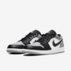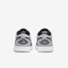O AJ1 Low “Smoke Grey Toe” apresenta uma estrutura de cano baixo, com base de couro branco com sobreposições em cinza e preto.