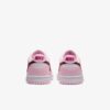 O Nike Dunk Low Pink Red White apresenta um cabedal de couro branco complementado por sobreposições rosa e um tom vermelho profundo, semelhante a roxo, marcando o Swoosh. O rosa continua até a proteção lateral, sistema de amarração e calcanhar, enquanto na parte inferior, o Nike Dunk mantém seu clássico esquema de cores com uma entressola branca e um solado e banda de rodagem rosa.
